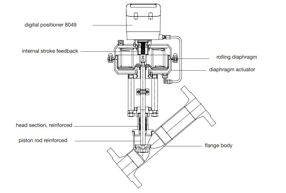 7036型采用角座设计的空压控制阀。角座结构确保高流量能力,法兰连接方式便于安装。集成式数字或模拟定位器采用紧凑设计。所有接触介质部件均由不锈钢制成。